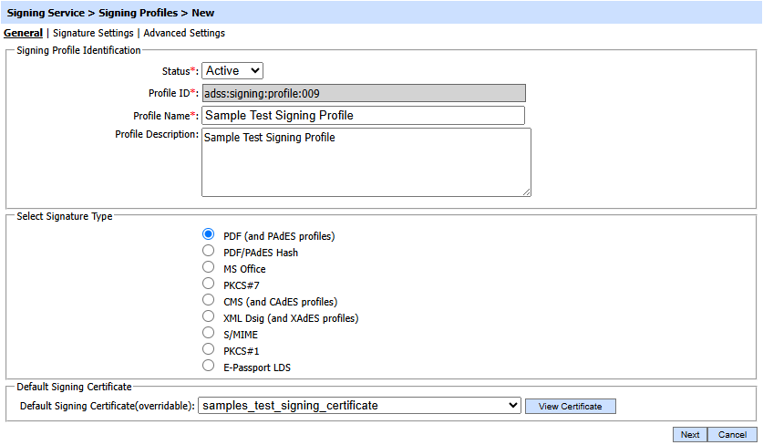 A signing profile may be marked Active or Inactive. An inactive signing profile cannot be used to process signing requests. |