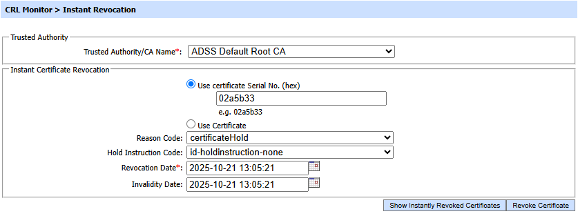 A certificate can be instantly revoked by directly providing the issued certificate serial number. This is needed when the ADSS Server operator does not have the hold of the certificate itself. The hexadecimal value of the certificate serial number should be entered. |