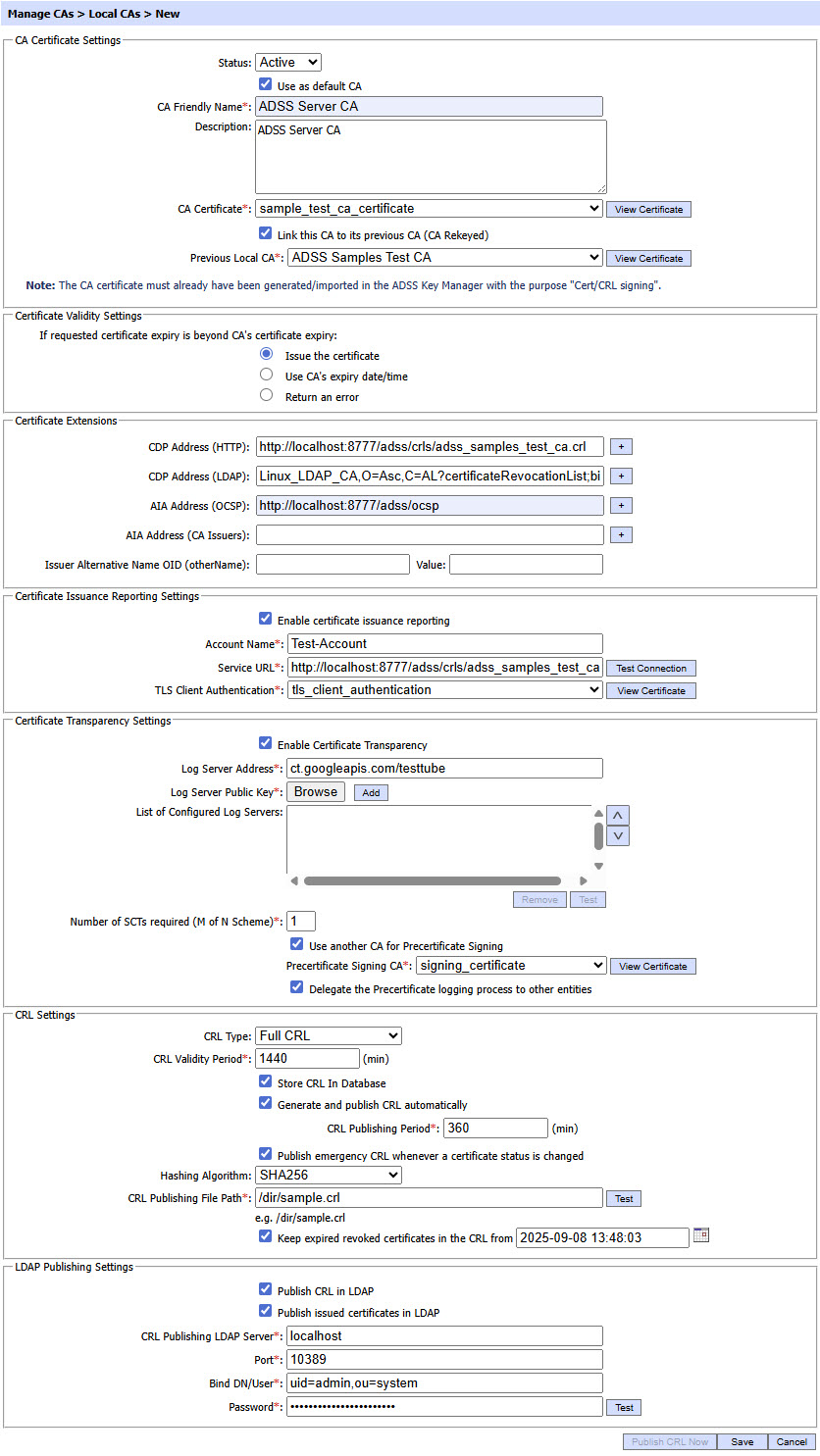 To configure an ADSS Server local CA, first generate (or import) a key pair for use as a 'Local CA'. The key pair must be assigned the purpose Cert/CRL Signing within the ADSS Key Manager module. The Local CA public key will then need to be certified using either a self-signed certificate or a certificate issued by higher-level CA. This Local CA can then be configured for online certification using the Manage CAs module. The following is the screen where you can configure the CAs.