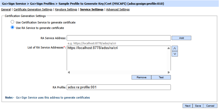 This page is used to configure the Certification Service or RA service by selecting the radio button that will be used to certify the keys generated through Go>Sign Desktop.