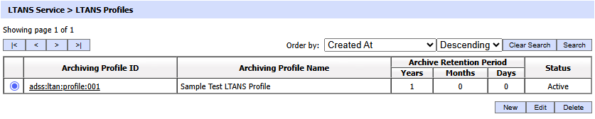 LTNS profiles can be sorted in either Ascending or Descending order according to the criteria: Archiving Profile ID, Archiving Profile Name, Created At and Status.