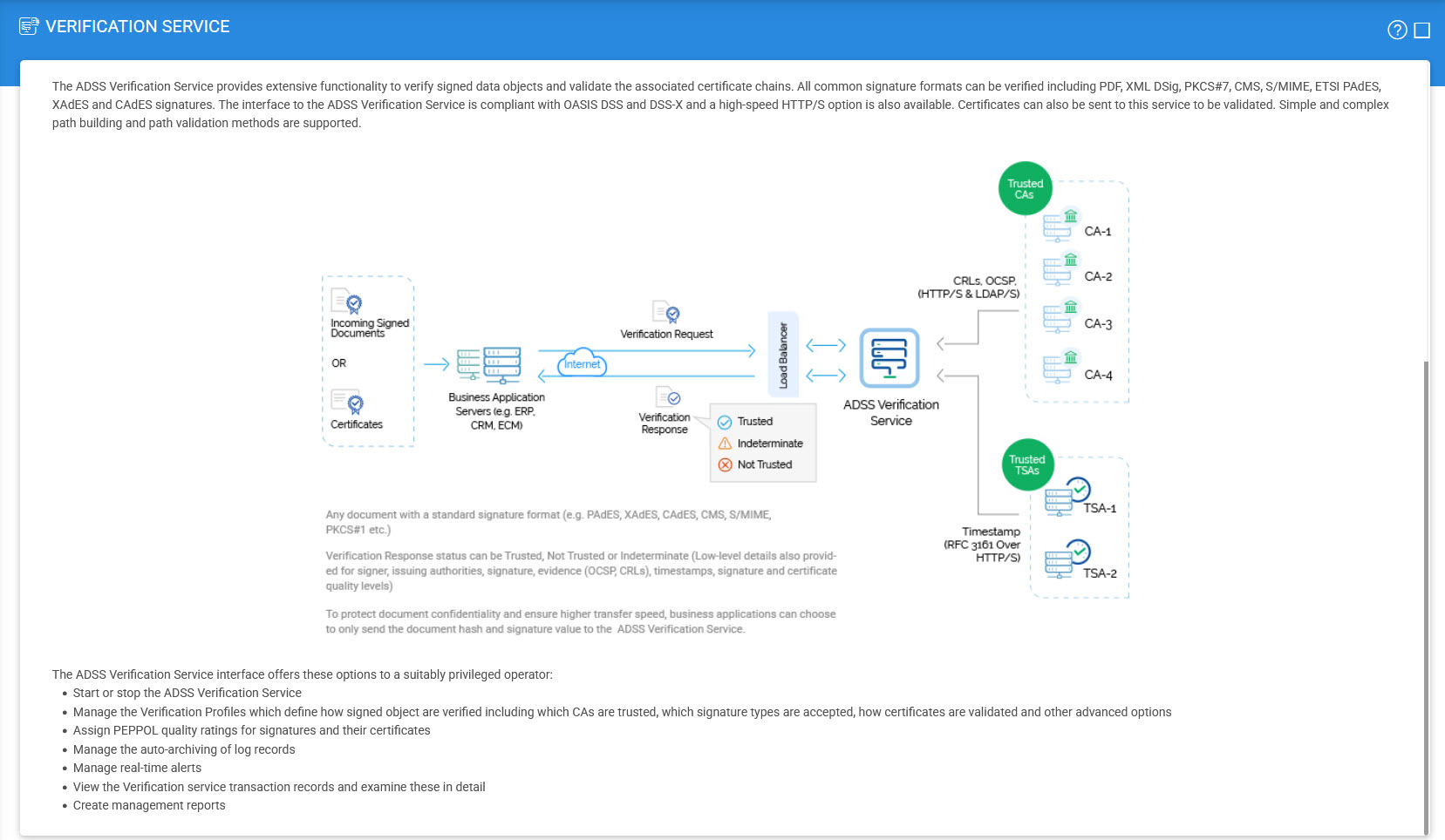 ADSS Verification Service provides OASIS DSS and DSS-X compliant data and document signature verification services for client applications. In addition, certification validation is supported. All common signature formats can be verified including PDF, XML DSig, PKCS#7, CMS, S/MIME, ETSI PAdES, XAdES and CAdES signatures. Simple and complex path building and path validation methods are supported. Commercially it is sold as ADSS Verification Server, ADSS PDF Server, ADSS XML Server and ADSS PKCS#7 Server.