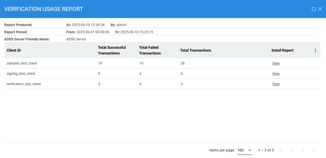 The Usage Report helps you track and review how your service is being used by different clients. It provides clear insights into which clients are sending requests to your service and identifies the clients who are using it most frequently. This makes it easier to understand usage patterns and client activity. The report is generated according to the date range you select, and you can further customize it using the Usage Preference drop-down menu. The available options are: 'Clients that send verification requests' and 'Clients that verified signatures.'