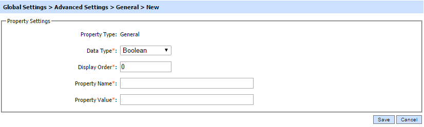 Operator can add custom properties for system, service or other level settings. Clicking on the new button available at the bottom of that particular page will show the following screen: