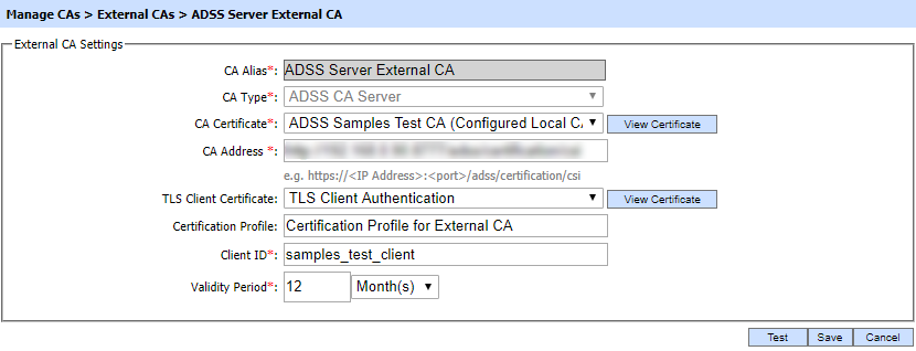 To configure the ADSS Server CA as an external CA select the ADSS CA Server from the CA Type drop down. The following page will be shown to configure the ADSS CA Server: