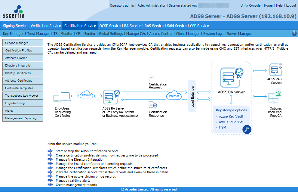 ADSS Certification Service module provides Certificate Authority services to client applications that act as RAs and request the creation of asymmetric key pairs and/or send public key for certification. RFC 2797 CMC, RFC 7030 EST Protocols are supported as well as SOAP/XML based proprietary protocol for applications that need extended functionality such as user registration, key generation and roaming credential management.