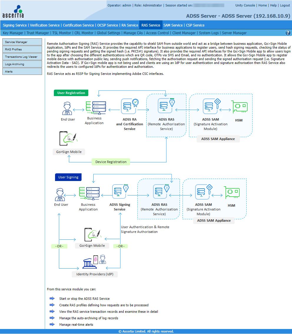 The main admin screen for the ADSS RAS Service is shown below. Details of the key features are described in the following sections: