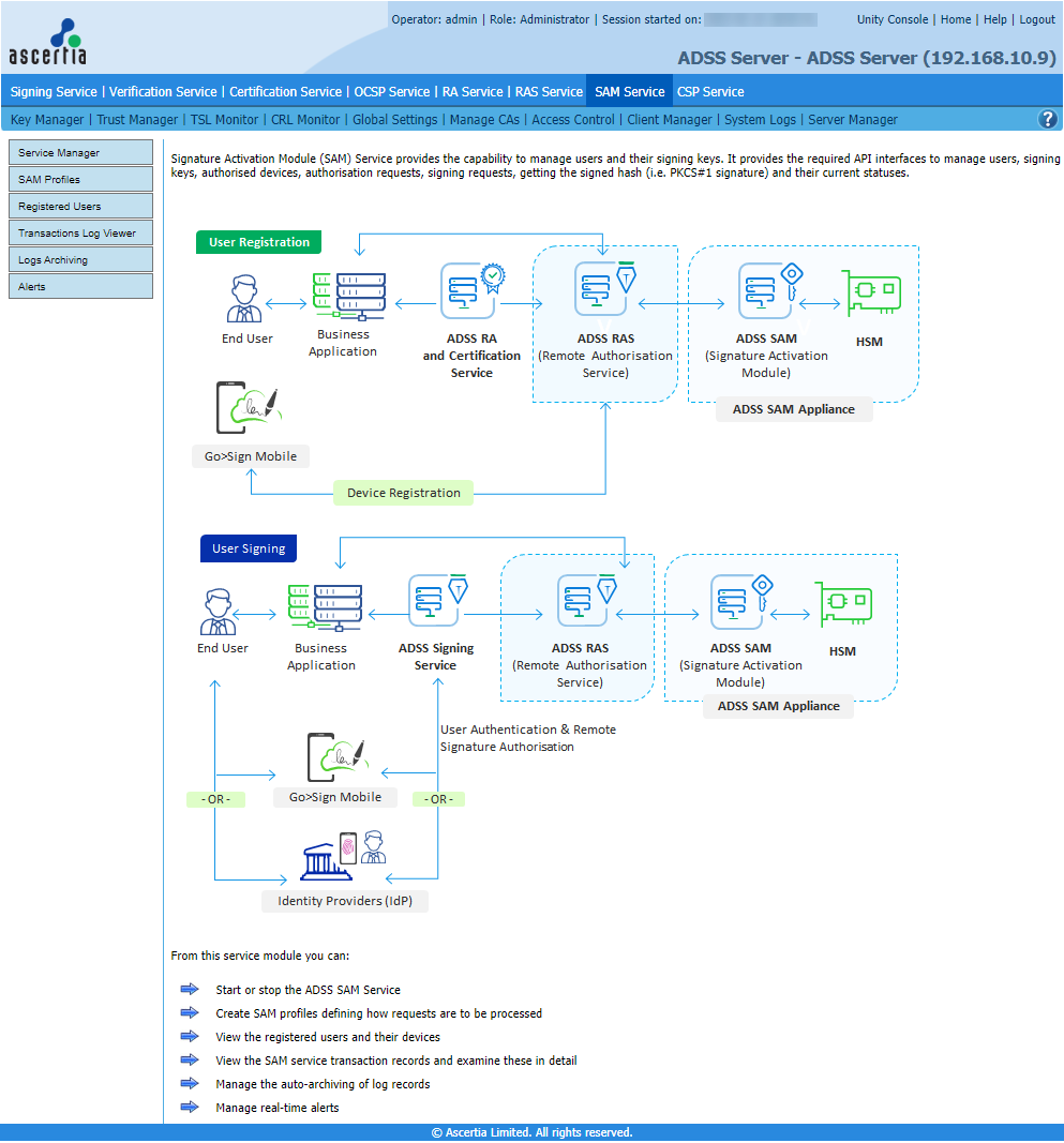ADSS SAM Service manages registered users and their unique signing keys. In addition, it manages the connection to the hardware security modules and manages key backup and restore.