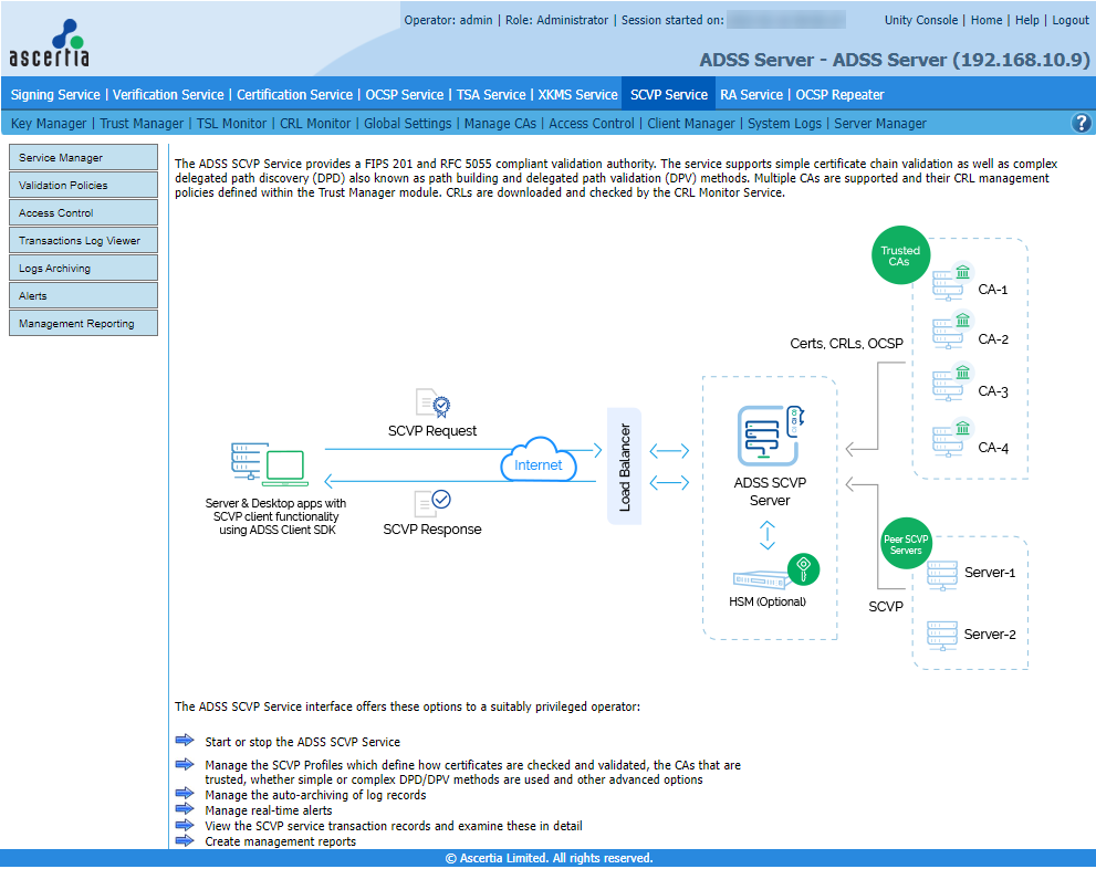 Following image shows the ADSS SCVP Service's home page and sub-modules, details of which are given in the next sections: