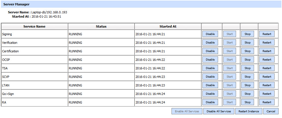Click on the services link from the Server Manager page and it will redirect you for ADSS Server Services. From this page you can enable/disable any one or all the services. You can also start/stop/restart all or any single service.