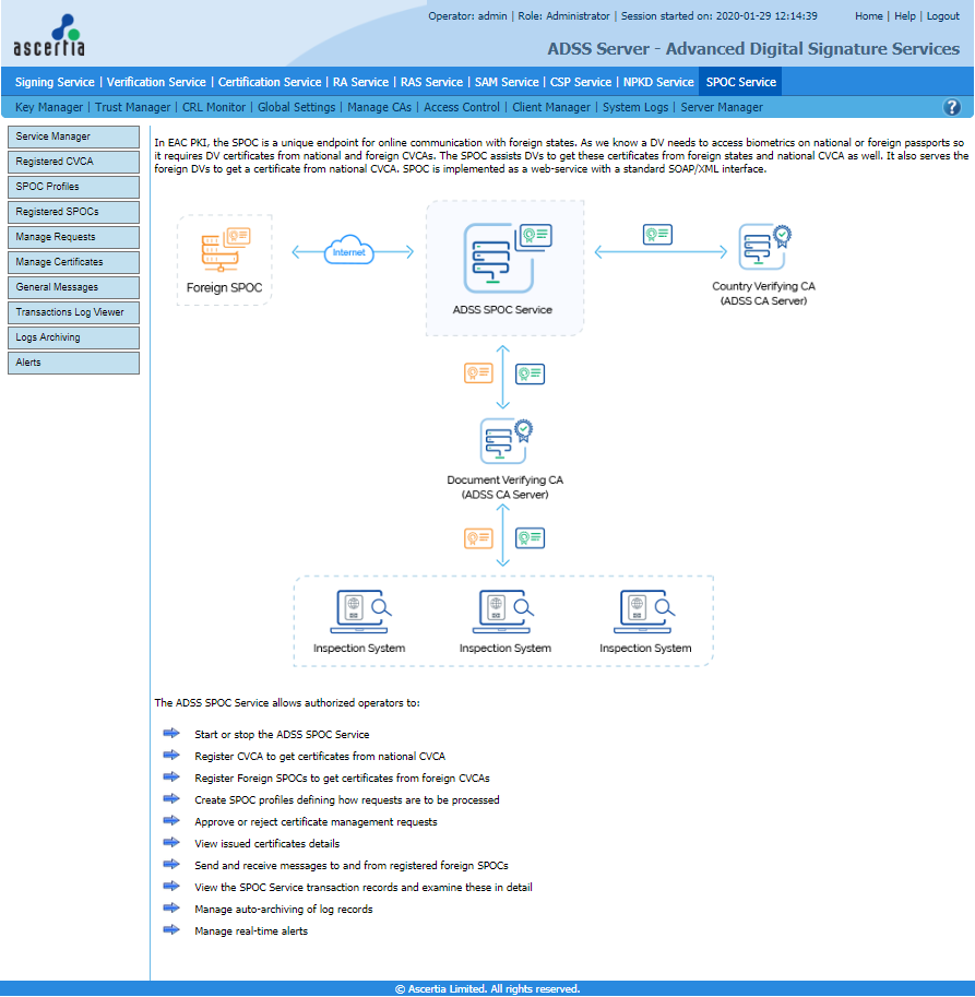 The main admin screen for the ADSS SPOC Service is shown below. Details of the key features are described in the following sections: