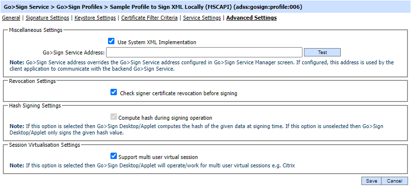Check this option if you wish to check the revocation status of the signer's certificate before signing. Note: This option will only be shown if Basic/BES signature type is selected and XML Encryption Settings are enabled on the Signature Settings page. Long-term signatures are automatically validated by the Verification Service during enhancement to timestamped or long-term signatures. |