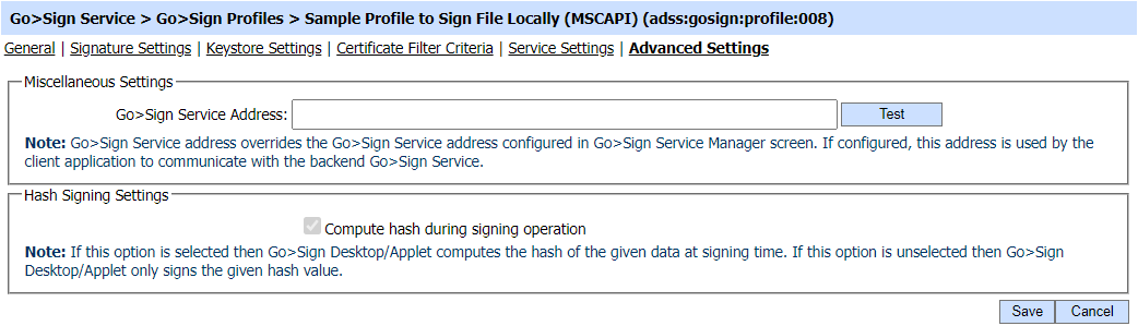 This defines the publically accessible address for the Go>Sign Service. Go>Sign Clients communicate with the Go>Sign Service using this address. The address provided here overrides the default Go>Sign Service address configured in the Go>Sign Service Manager settings. Note: For complex integrations such as Ascertia's SigningHub, the Go>Sign Service may only be accessible via reverse proxy configurations, e.g. using the Apache Tomcat AJP Connector. This allows Go>Sign Clients to communicate with Go>Sign Service via the business application hosted address. Click here for Instructions on how to configure the Apache Tomcat AJP connector for different web servers. |