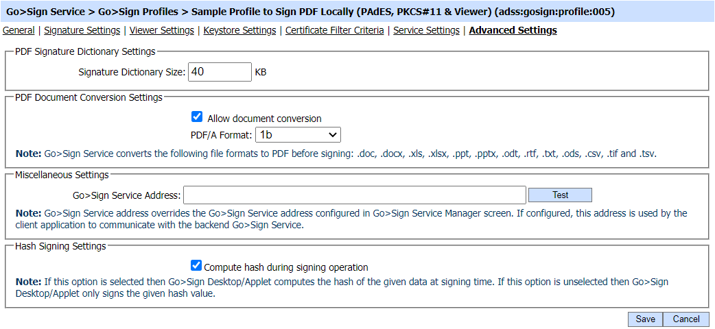 For PDF/PAdES profiles the following settings are shown: