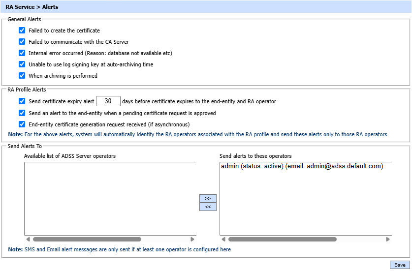 The ADSS RA Service can be configured to generate email, SMS and/or SNMP based general alerts when the following events occur: