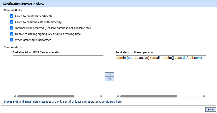 ADSS Certification Service sends an alert to the relevant operators when it fails to create a certificate for whatever reason.