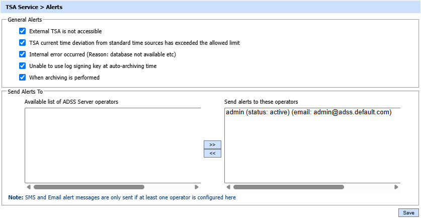 When enabled, the ADSS TSA Service will send an alert to configured system operator(s) whenever it fails to communicate with an external TSA. |