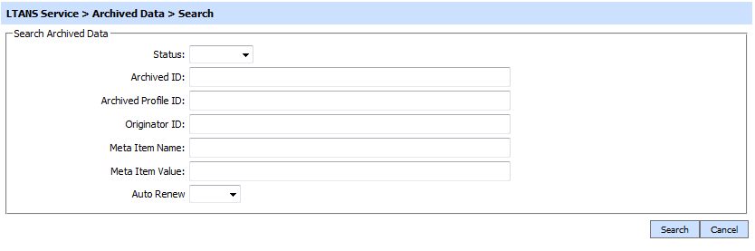 In order to review the inactive archives, click on the Search button and select inactive archives. Search operations can also be performed using other parameters including Archived ID, Archived Profile ID, Originator ID, Meta Item Name and Meta Item Values.  If more than one search criteria is provided, these are combined using an AND operator.