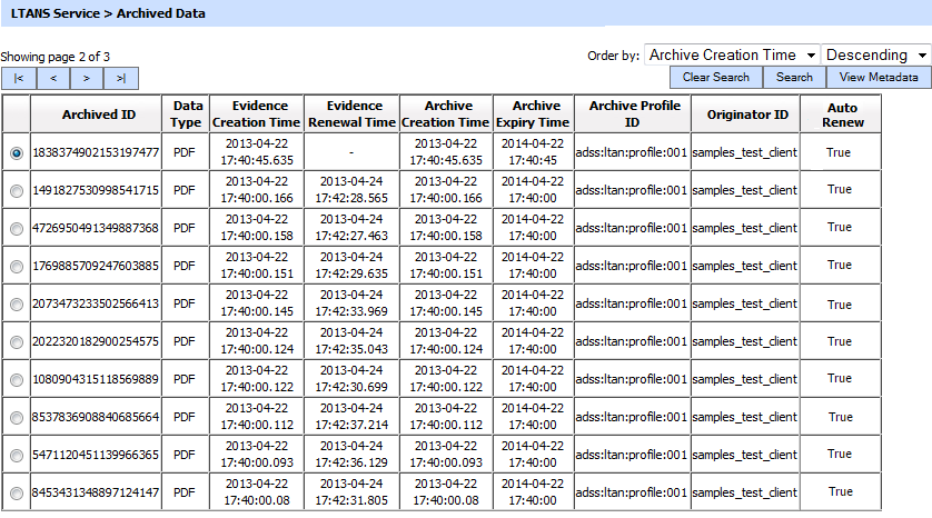 The list of generated archives can be sorted in either ascending or descending order based on the following parameters:  Archived ID, Profile ID, Originator ID, Archive Creation Time and Data Type.