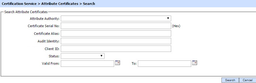 Clicking on the Search button on the Certification Service >> Attribute Certificates main page will display the following screen: