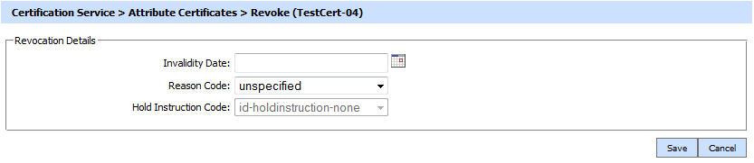 You can select a certificate, and then either View or Revoke or Reinstate or Delete it. Clicking on the Revoke button will show the following screen where invalidity date, revocation code and hold instruction code can be provided before revoking the certificate: