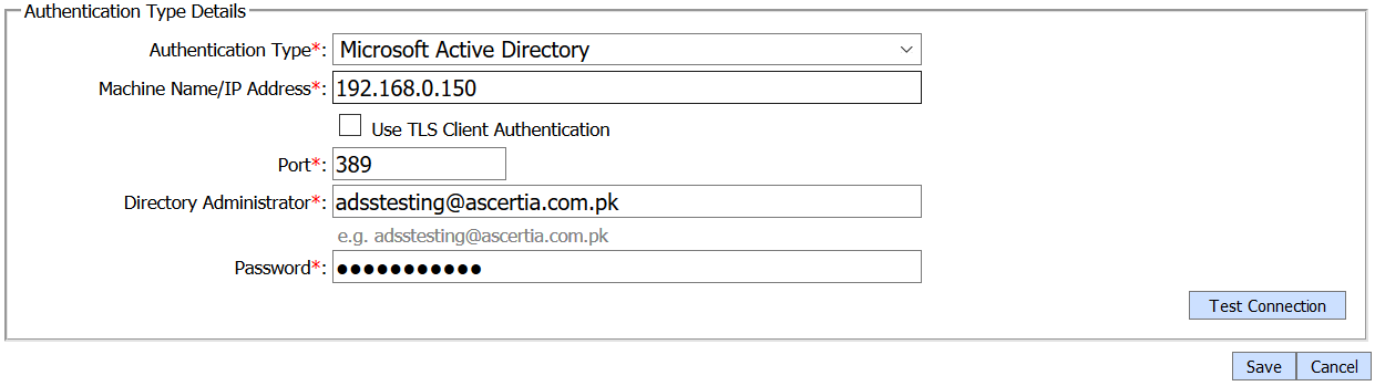 10. Click on the 'Test Connection' button in order to ensure that credentials are correct and a connection has been established with Microsoft Active Directory.