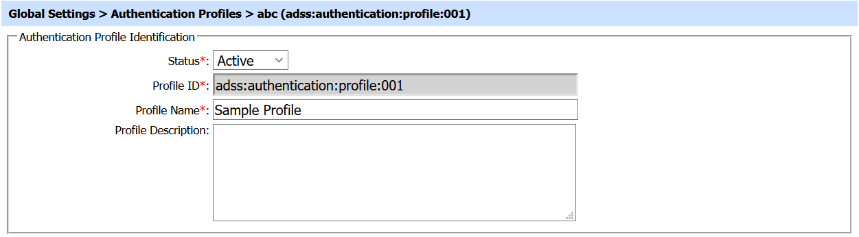4. Profile Status will be 'Active' by default. Profile ID field will be pre-populated inside Authentication Profile Identification section while creating a new authentication profile. Enter Profile Name and Profile Description (if needed) in their respective fields.