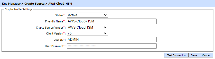 To generate a new AWS CloudHSM profile press the New button in the Crypto Source Screen and select AWS CloudHSM in Crypto Source Type drop down: