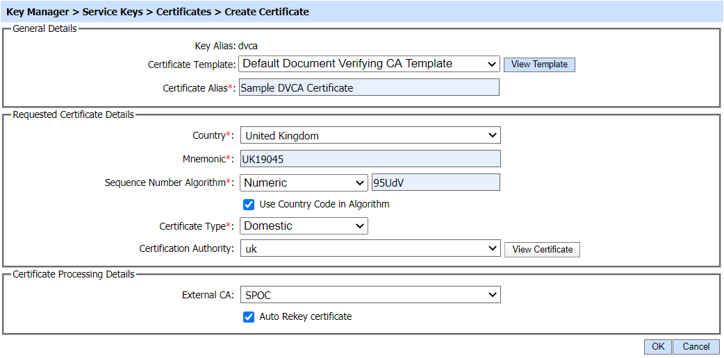 Before creating a DVCA Certificate, configure Domestic or Foreign CVCA in the Trust Manager module. Also, the operator must register a SPOC Server in External CAs module. To register a SPOC Server, click here.
