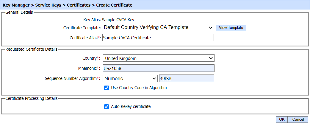 If the Auto Rekey checkbox is checked, the CVCA certificate will automatically be re-keyed before it's expiry. The rekey time can be set to defined number of hours before the certificate expiry. Navigate to Key Manager > Auto Renew Certificates. |