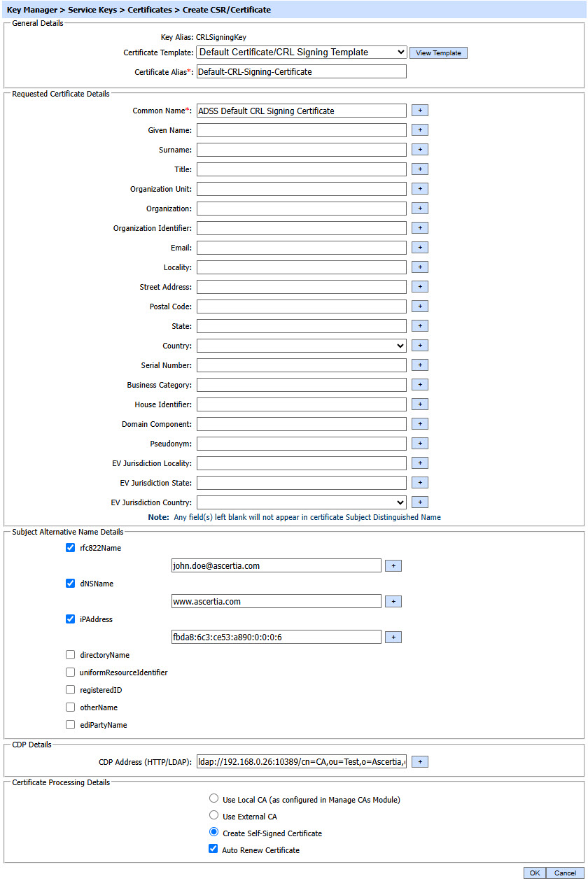 The CDP Address field will be available to the operator while creating a self-signed certificate and the CDP extension will also be enabled in the certificate template. |