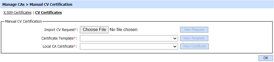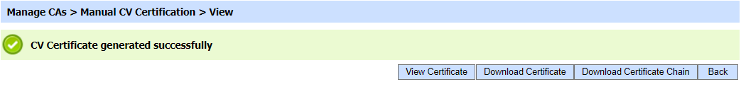 This module is used to manually certify the CV certificates either by a CVCA or DVCA. A CV certificate request is uploaded here and the relevant CA can be selected to issue the certificate. The generated certificate can be exported to file system and provided to requester.