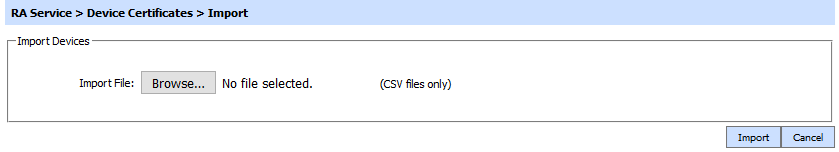 You can import device details in a comma separated file (CSV). Click Import button and the following page shown:
