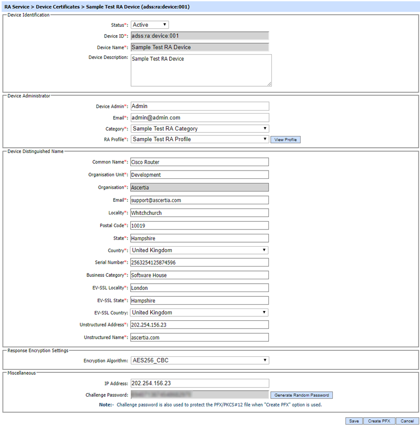 If device administrator doesn't want to use SCEP or PKCS#10 / CSR based approach then the RA Operator can use the Create PFX button. Once the key/certificate is generated then certificate/PFX is made available for download on the RA console.
