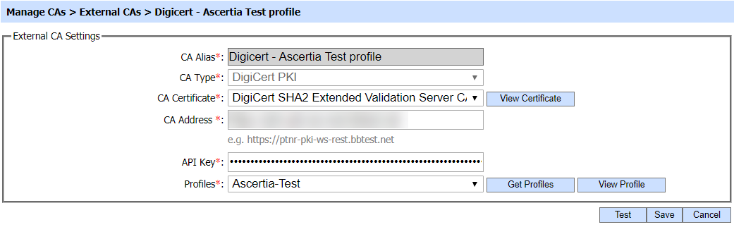 To configure the DigiCert PKI v8.0 CA as an external CA, select the DigiCert PKI option from the CA Type drop down. The following page will be shown to configure the DigiCert PKI: