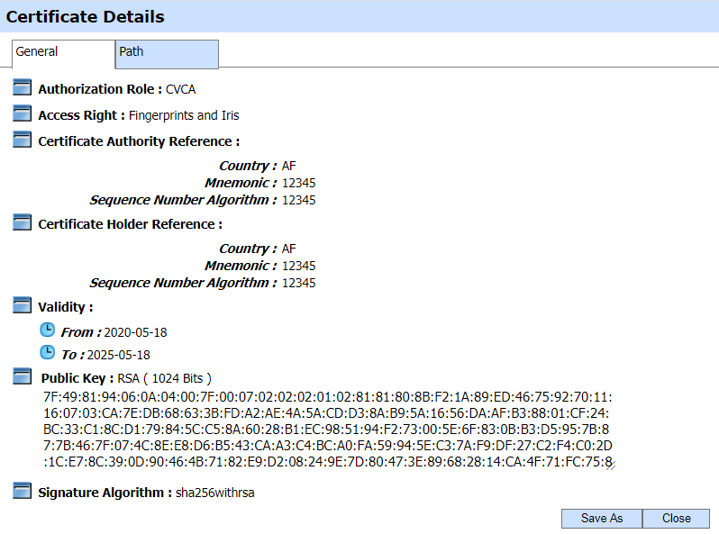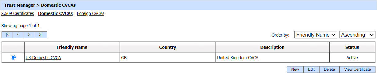 The configured CVCA certificate can be viewed by selecting the Domestic CVCA and then by clicking on the View Certificate button.