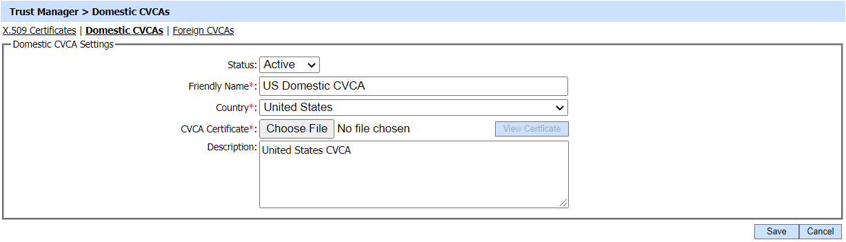By clicking the New/Edit button, the following screen will be shown where you can configure your domestic CVCA(s).