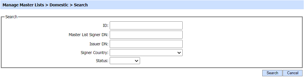 Enter the search criteria based on ID, Master List Signer DN, Issuer DN, Signer Country and Status. If more than one search parameters are provided, these are combined using the "AND" operator and the results are presented accordingly.