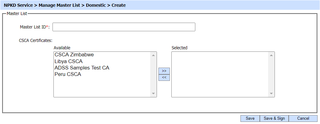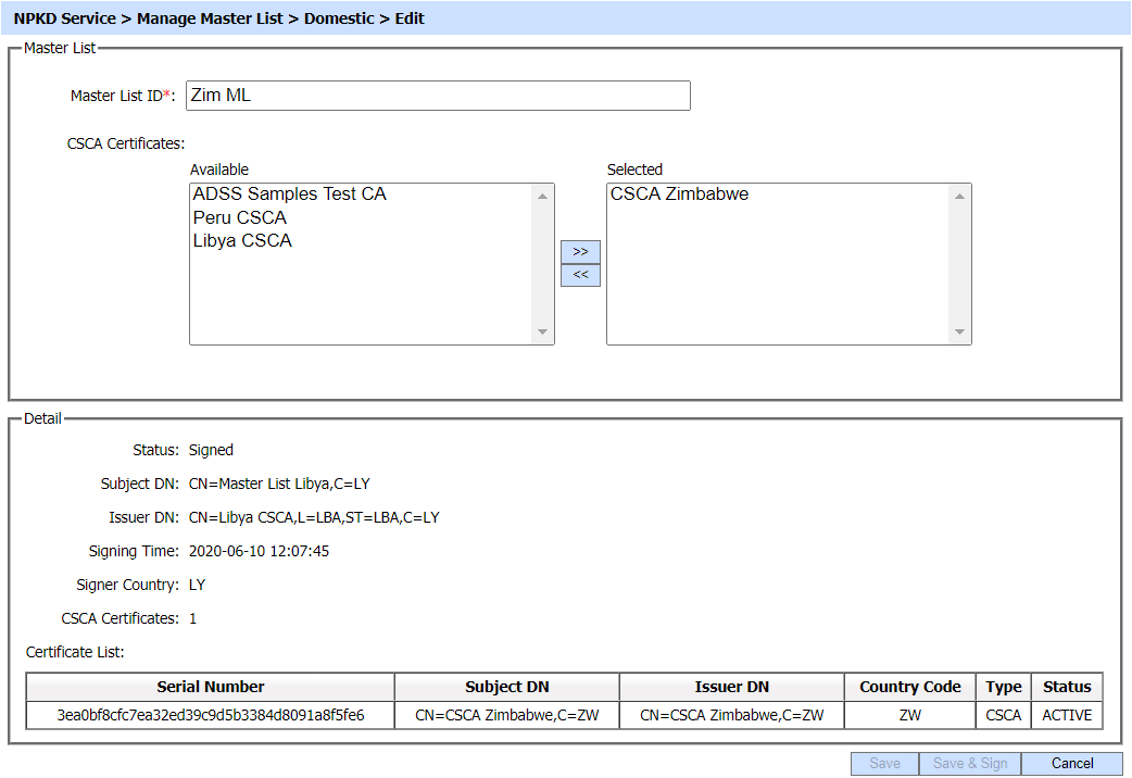 Clicking on the 'Save' button will create a new Master List but it will still be unsigned and could not be published to ICAO PKD. Clicking on the 'Save & Sign' button signs a Master List with the selected Master List signer certificate and can be published to ICAO PKD.