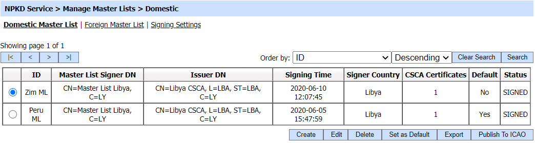 • Signed: In this state, the Master List has been signed by Master List signer certificate and ready to be published to ICAO PKD or to be provided to Domestic Inspection Systems. Once signed, the Master List cannot be edited.