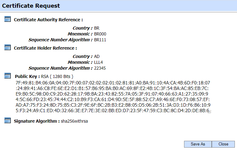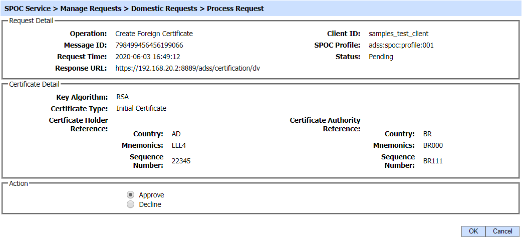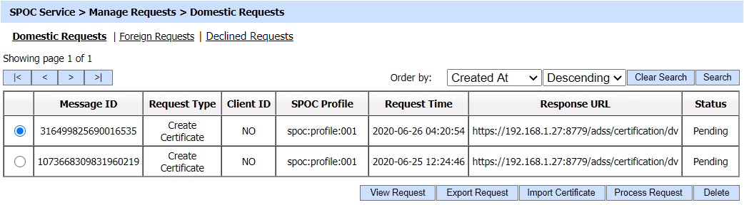 Clicking on the Export Request button will export the request to the file system. The operator needs to export the request in scenarios when the CVCA is operating in an offline mode. In this case the SPOC is unable to forward the request to CVCA in online fashion so the request is exported to file system and shared with CVCA using an out-of-band mechanism in order to get the required certificate. This request is then imported to CVCA via Manual Certification inside Manage CAs module and a certificate is generated. This certificate is exported to the file system and provided to the SPOC operator.