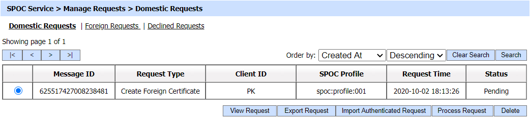 A particular Domestic Request can be searched based on Message ID, SPOC Profile, Client ID, Operation, Request Type and Request Time. If a search is based on multiple values, then these will be combined together using the “AND” operand, and thus only records that meet all the criteria will be presented.