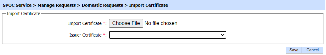 Once the certificate is received from CVCA, it can be imported to SPOC Service by clicking on 'Import Certificate' button against the same request. Clicking on the Import Certificate button will display the following screen: