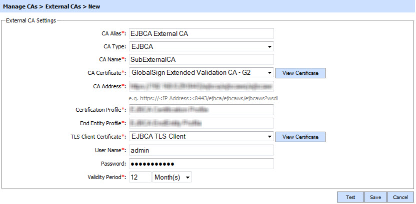 To configure the EJBCA as an external CA select the "EJBCA" from the "CA Type" drop down. The following page will be shown to configure the EJBCA.