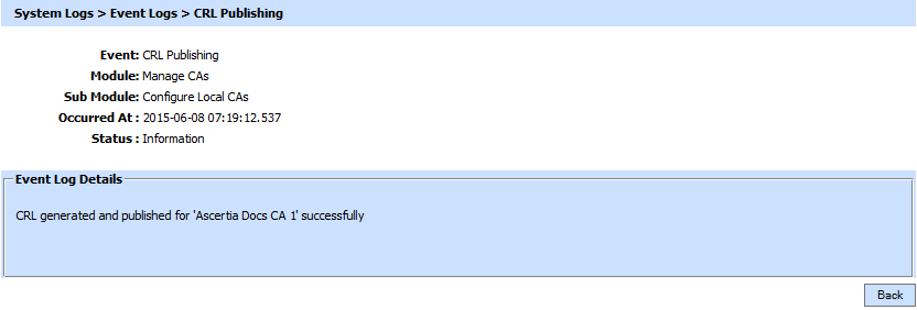 All automated events (e.g. CRL publishing, Email alert sending, certificate renewal etc) are logged in Event Logs Area. Note that automated events for CRL polling and retrieval of CRLs are separately logged in CRL Monitor Logs. See the CRL Monitor Log section for more details.