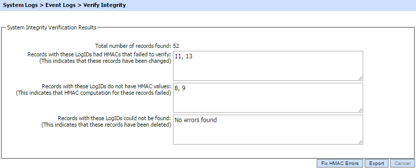 Verifies the integrity of the Event logs. It detects tampered and deleted records and generates a report that can be exported to the physical drive. When exporting HMAC verification report, it is recommended to save the file with “.html” extension so that the report can be viewed in an internet browser. |