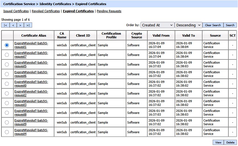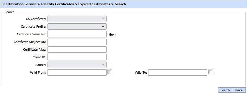 This helps to locate a certificate that the Certification Service may have expired. Certificates can be searched based on issuer, certificate profile, certificate serial number, certificate subject DN, certificate alias, client ID, source, and validity period. If a search is based on multiple values, then these will be combined together using the “AND” operand, and thus only records that meet all the criteria will be presented.