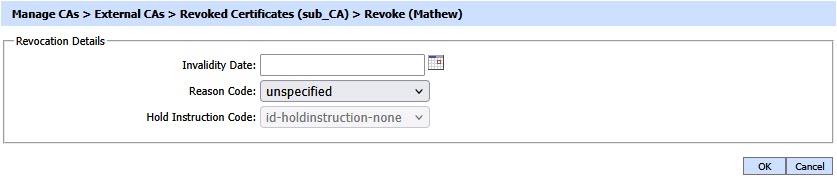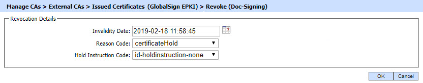 You can select a certificate, and then either View, Revoke or Delete it. Clicking on Revoke button will show the following screen where invalidity date, revocation code and hold instruction code can be provided before revoking the certificate: