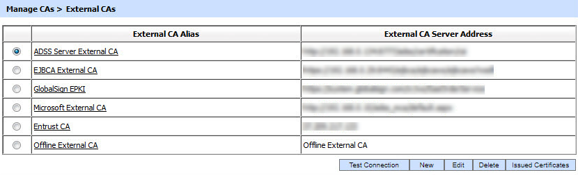 To configure the settings for external CAs, click the Configure External CAs button in the screenshot below. This shows a list of configured external CAs: