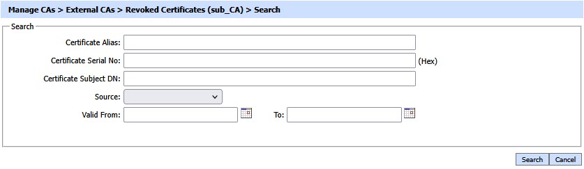 By clicking on the Revoked Certificate tab after selecting the External CA, the following screen will be displayed where all the certificates revoked by the External CA are shown: